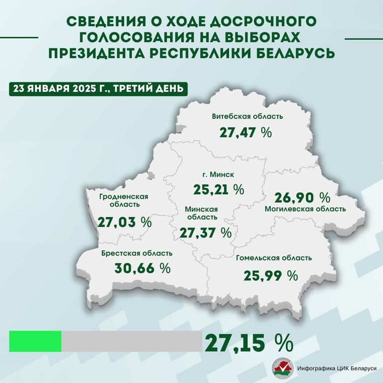 В Брестской области получили бюллетени 30,66% граждан, в Витебской — 27,47%, в Гомельской — 25,99%, в Гродненской — 27,03%, в Минской — 27,37%, в Могилевской — 26,90%, в Минске — 25,21%.