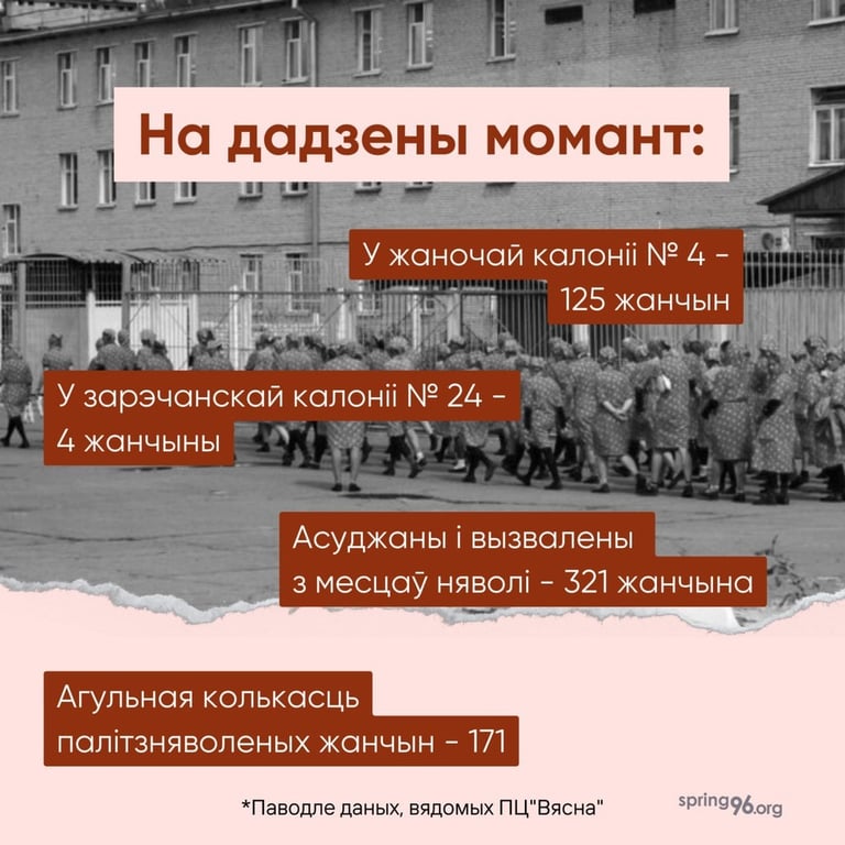 Как сообщает правозащитный центр Вясна, сегодня в Беларуси 171 политзаключенная женщина, которые в данный момент содержатся в местах лишения свободы.