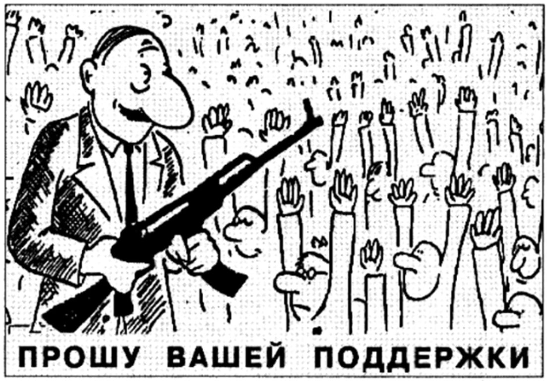 Герой крыкатуры таксама яе «прасіў», і людзі ўздымалі рукі. Але было адно «але»: карыкатурны Лукашэнкі трымаў у руках аўтамат, а натоўп не ўсміхаўся, ён здаваўся ў палон.