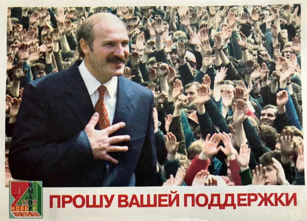 Гэта была пародыя на ягоны агітацыйны плакат. На ім ён быў прыфоташолены да выявы натоўпу, што ўздымаў рукі ў вітанні. Лукашэнка ішоў на рэферэндум з лозунгам «Прашу вашай падтрымкі».