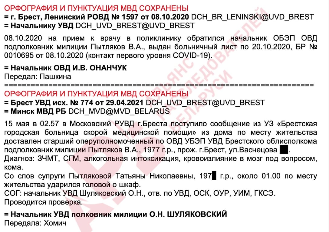 Ночью 15 мая 2021 года в Брестскую больницу скорой медицинской помощи в состоянии комы, вызванной алкогольной интоксикацией, черепно-мозговой травмой, сотрясением головного мозга доставлен бывший начальник ОБЭП, получивший повышение по службе на должность старшего оперуполномоченного по особо важным делам УБЭП УВД Брестского облисполкома подполковник милиции В.А. Пытляков. С помощью медицинской инициативы «Белые халаты» удалось узнать, что высокопоставленный убэповец умер.