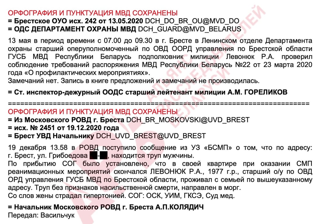 19 декабря 2020 года в своей квартире скончался 43-летний старший оперуполномоченный по особо важным делам управления ГУСБ МВД подполковник Р.А. Левонюк.