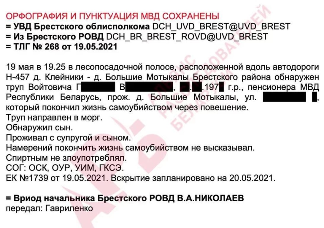 Первым ушел из жизни полковник в запасе Геннадий Войтович: 19 мая 2021 года в лесополосе у дороги в Брестском районе его нашли повешенным. Покойный вышел на пенсию в конце 2020 года с должности начальника управления охраны правопорядка УВД Брестского облисполкома. На пенсии жил в пригороде Бреста с женой и сыном-сотрудником МВД, спиртными напитками не злоупотреблял, намерений покончить жизнь самоубийством не высказывал.