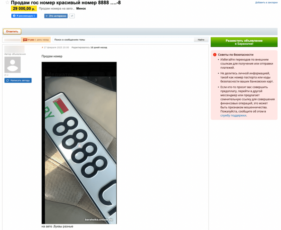 Но возвращаемся к восьмеркам. Вот кто-то пытается сбыть комбинацию с пятью повторяющимися цифрами. Одна из букв — С, вторая на фото не видна. Указанная стоимость — 29 000 рублей (около $ 9200).