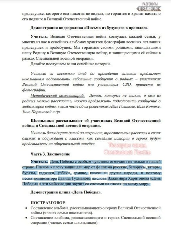 Среди народов, которые учитель должен перечислить на «Разговорах о важном», нет ни слова об украинцах, обращает внимание Соловьиный помет. И напоминает, что в годы войны погибло более 10 млн украинцев: