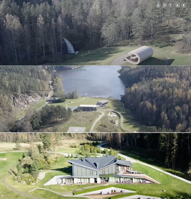 На этих кадрах видно, что на берегу залива Марьялахти в Карелии у российского лидера — три дома в современном стиле, две вертолетные площадки, несколько пирсов для яхт, форелевая ферма и хозяйство с коровами для производства мраморной говядины, а также личный водопад. Рядом с резиденцией Путина «Досье» обнаружил также нового соседа — Романа Абрамовича.