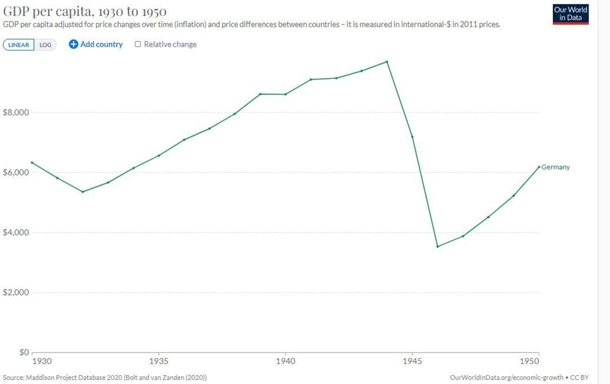 Предлагаем Путину, Хазину и другим «экспертам Царьграда» посмотреть на этот график ВВП на душу населения той же самой Германии 80 лет назад, — пишет Дмитрий Чернышев. — Видите, когда он достиг наивысшего показателя? В 1944 году.
